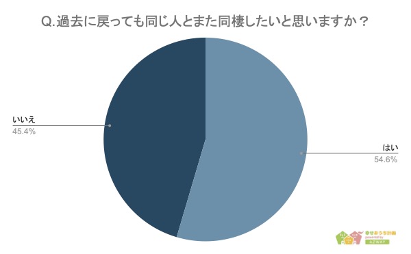 また、「過去に戻ってもまた同じ人と同棲するか」について聞いたところ、「はい」は191人(54.6%)、「いいえ」は159人(45.4%)という結果に。「はい」の人数は「同棲して良かった」と思う人の数よりも少なくなっており、同棲した結果、相手とうまくいかなかった人が一定数いることがわかります。
