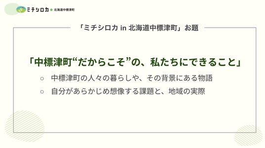 この度開催する「ミチシロカ in 北海道中標津町」の最終日に開催するフィールドワーク活動報告会では、道外からきた9名の大学生が、中標津町でのフィールドワークを通してリサーチした地域の魅力や課題をもとに、地域貢献・地域活性化につながる提案を成果として発表します。