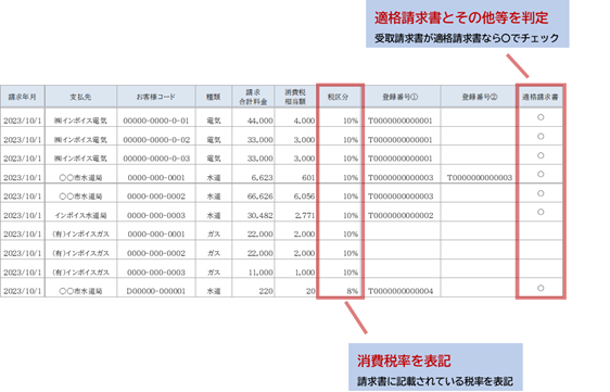 ▼水道光熱費の請求書が適格請求書か否かを、統一したレイアウトで確認できる