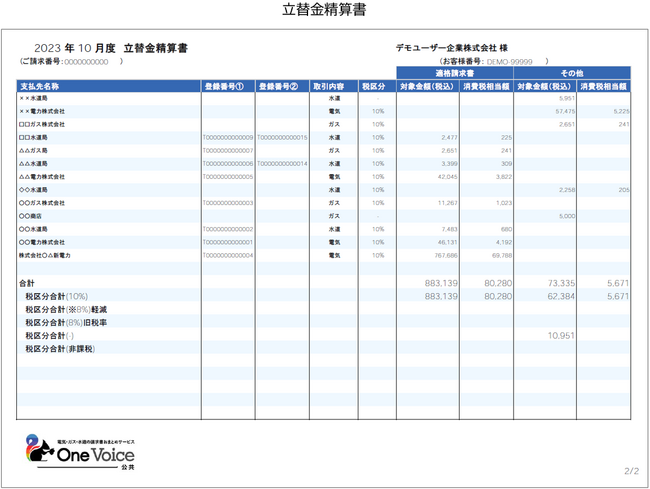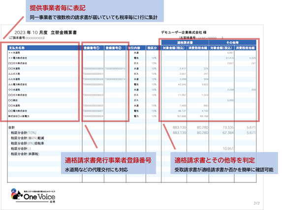 OneVoice公共事業者登録番号・税率など仕入税額控除に必要な情報を提供事業者毎に集計した立替金精算書を発行するので、適格請求書の保存が毎月1回に軽減できます。