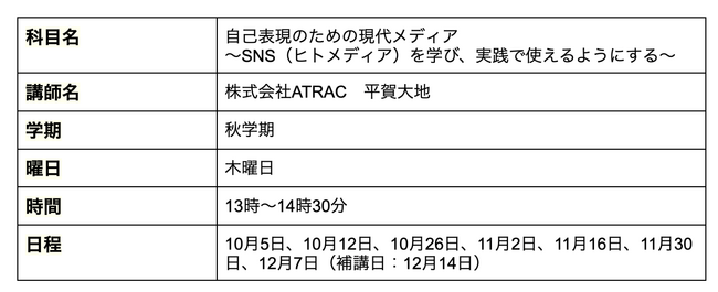 デジタルを中心としたマーケティング支援を展開する株式会社ATRAC(東京都渋谷区、代表取締役社長:三和 大輔)執行役員 兼 SNSマーケティング本部長の平賀 大地は、2023年10月~12月、早稲田大学 Life Redesign Collegeにて、専門科目群/Communication(コミュニケーション)領域/「自己表現のための現代メディア」と題し、SNS(ヒトメディア)に関する講義を全7回にわたり開催します。