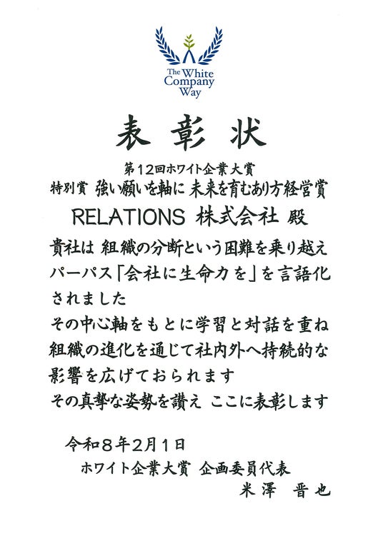 2026年2月1日、第12回ホワイト企業大賞にて、RELATIONS株式会社(以下RELATIONS)は、特別賞【強い願いを軸に 未来を育むあり方経営賞】を受賞いたしました。