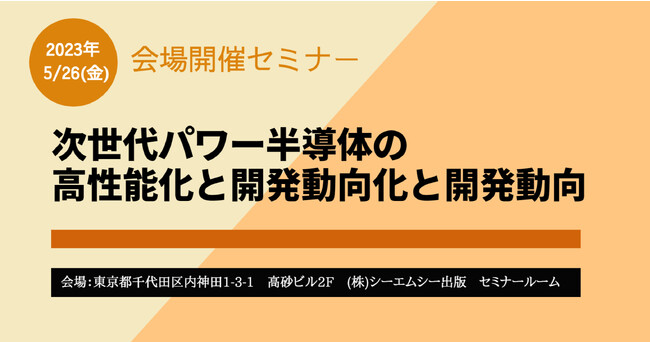 化学・電子工学などの技術・市場動向レポート発行やセミナー開催を行う、株式会社シーエムシー出版(本社:東京都千代田区、代表:辻賢司)は、5月26日(金)13:30~16:40に「次世代パワー半導体の高性能化と開発動向」セミナーを開催します。新型コロナウイルス感染症の5類移行に伴い、2023年5月から東京都内を中心に会場を設け、産業技術セミナーを開催します。