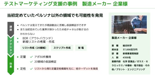 - ターゲットに向けた事前調査に基づく、1to1型の高品質な新規開拓を実施