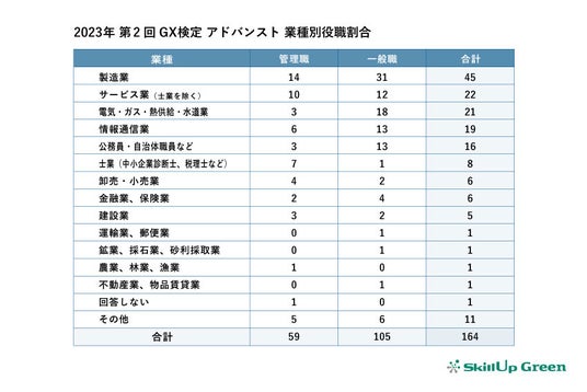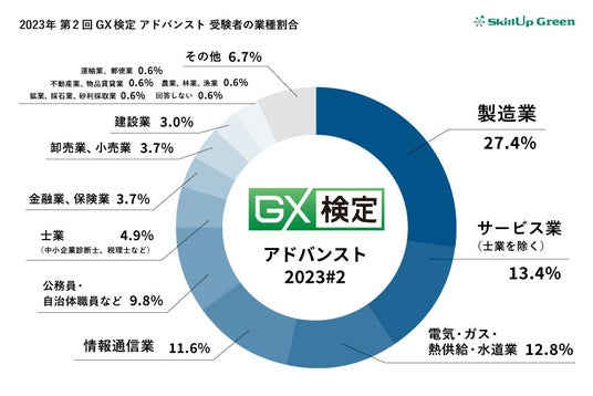 「2023年第2回GX検定 アドバンスト」の受験者を業種別に見ると、製造業が27.4%で最多となりました。次いでサービス業(士業を除く)が13.4%、電機・ガス・熱供給・水道業が12.8%となっています。