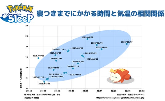 『Pokémon Sleep』のユーザーデータによると、5月末から6月にかけて徐々に気温があがり、就寝に かかる時間が長くなることが観測されています。これからさらに寝苦しくなる夏本番にむけて啓発活動 に取り組んでまいります。