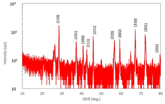結晶を粉末状にし、X線回折法で構造評価したところほとんどのピークがr-GeO2に由来するものであると確認されました。r-GeO2の結晶のファセット面をX線回折法で評価したところ、ファセット面は(110)面であることが確認されました(図2)。