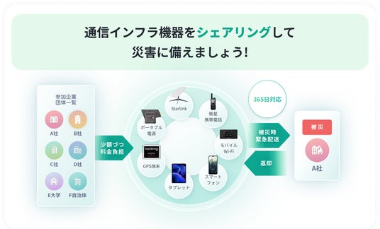 全国の契約者で通信インフラ機器をシェアリングする形式で、被災した場合に緊急配送にてお届けし、利用いただくというサービス形態です。