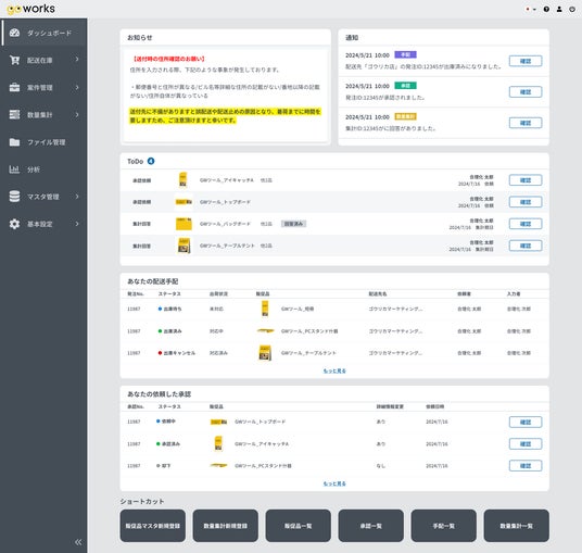 ・販促物の出庫状況や承認申請の状況、アクションが必要なタスクの通知などが、トップ画面に表示され、管理・注文のステータス状況が把握しやすくなり、業務の滞りやブラックボックス化を防ぎます。