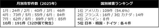 国別被害ランキングでは、日本・韓国ともに「Qilin」による被害が4件で同率5位となっています。報告書は「最近では、韓国および日本企業をターゲットとした攻撃が著しく増加している」と明記しており、両国に対する脅威の高まりは今後も注視が必要です。なお、2025年10月には単月191件と過去最多を記録しており、攻撃ペースの加速は顕著です。