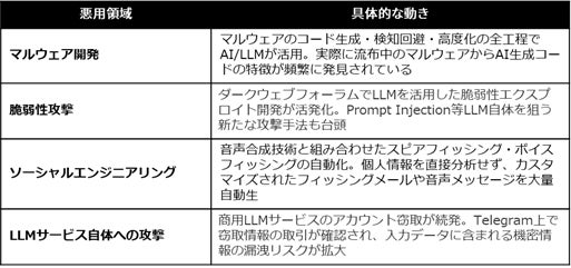 2025年、生成AIはサイバー攻撃の「武器」として本格的に活用され始めています。報告書では、以下の4つの領域で具体的な悪用事例が確認されています。