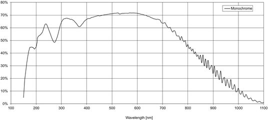 PhotonfocusのUVカメラは、汎用イメージセンサをベースとした製品ではありません。深紫外の光子をシリコン表面で効率よく検出することを目的に設計された、独自のUV専用センサを採用しています。このセンサは下記のような特徴を持ち、200nm以下の波長を直接検出可能としています。