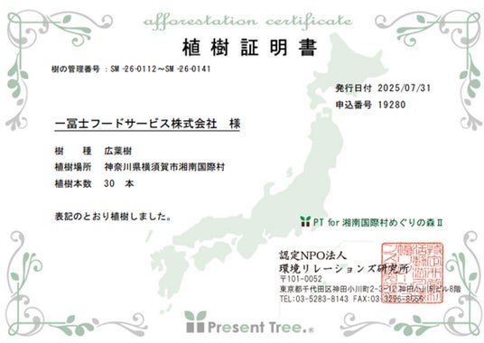 一冨士フードサービス株式会社(本社:大阪府大阪市、代表取締役社長:大西 博史、以下「当社」)は、認定NPO法人 環境リレーションズ研究所(所在地:東京都千代田区、理事長:鈴木 敦子)が運営する、森づくりと地域振興を結びつける事業「Present Tree」の活動に賛同し、2025年7月に30本分の植樹を寄付いたしました。