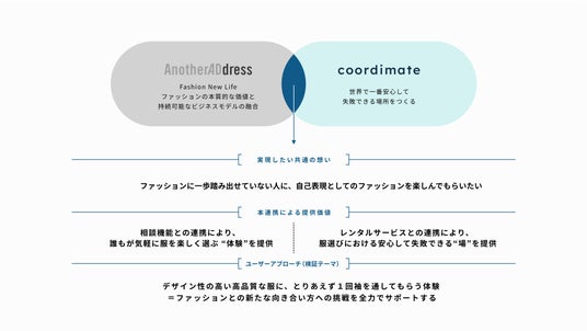 「coordimate」と「AnotherADdress」は、異なるアプローチで「誰もが自分らしくファッションを楽しめる世界」を共にめざしており、「ファッション潜在層に、自己表現としてのファッションを楽しんでいただきたい」という両者共通の想いが一致したため、サービス提供開始に至りました。