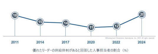 - 「自社のリーダーの供給体制が優れている」と回答した人事担当者は、2011年の18%から2020年に11%へと減少。しかし、2024年には20%へと回復傾向