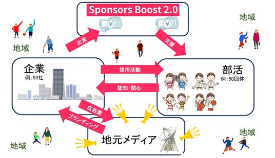 地方共生型モデルの「SPONSORS BOOST 2.0」 は、地元企業が集まって、地元の部活や学生を支援することで、学生の活動が広がるだけでなく、その企業の名前や事業内容は、学生だけでなく、彼らの家族や大学、地域に浸透していきます。
