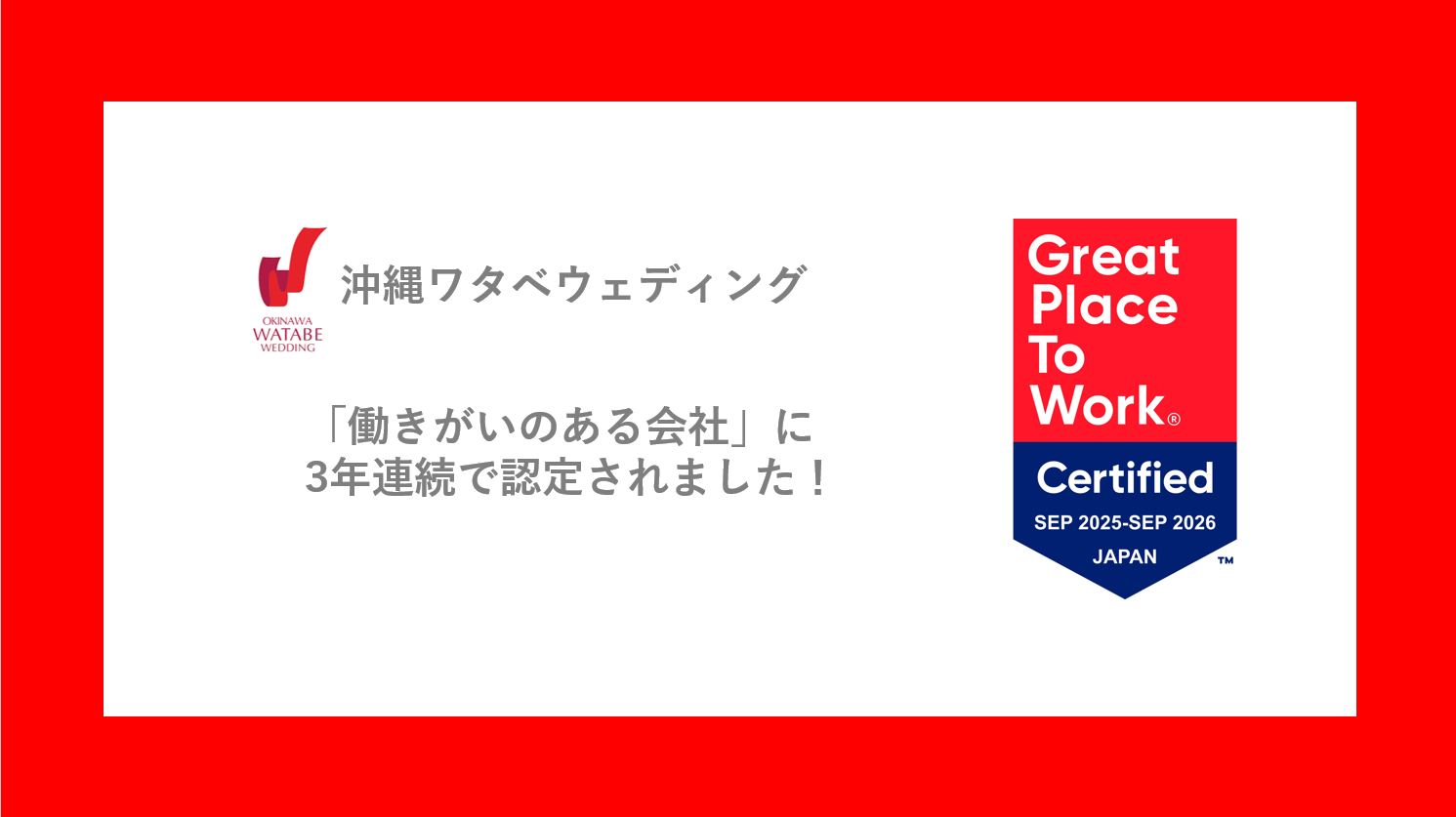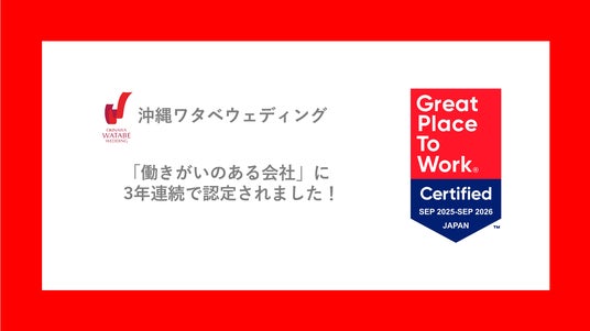 沖縄ワタベウェディング株式会社(本社:沖縄県那覇市、代表取締役:田渕浩之)は、Great Place to Work(R) Institute Japan(以下、GPTW Japan)が実施する調査により、2025年9月、「働きがいのある会社」に3年連続で認定されました。「働きがいのある会社」認定とは、調査にエントリーした企業と従業員に対してGPTW Japanがアンケートを実施し、調査結果が一定水準を超えた企業を1年間「働きがいのある会社」として認定する制度です。2024年の認定時に引き続き2025年も「入社した人を歓迎している」という項目が高評価でした。