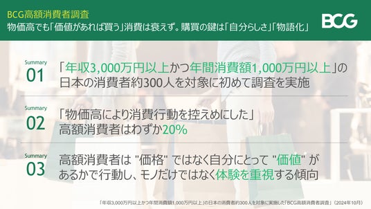 経営コンサルティングファームのボストン コンサルティング グループ(以下、BCG)は、「年収3,000万円以上かつ年間消費額1,000万円以上」の日本の消費者約300人を対象に「BCG高額消費者調査」を初めて実施し、その結果を公表しました。