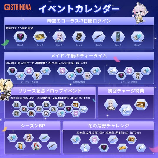正式サービス開始を記念して、7日間ログインボーナスイベント「時空のコーラス」をはじめ、ゲーム内外で各種の豪華キャンペーンを開催します。詳しくは、公式X(旧Twitter)「@Strinova_JP」や公式サイトをご確認ください。
