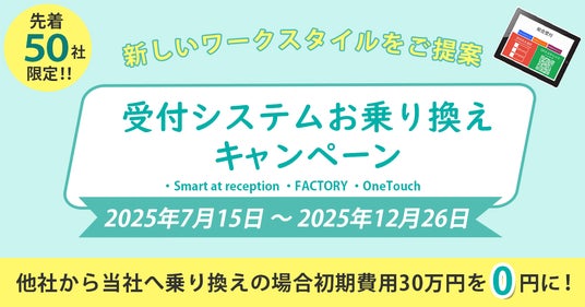 M-SOLUTIONS株式会社(本社:東京都新宿区、代表取締役社長:植草 学、以下 M-SOLUTIONS)は、他社製の受付システムをご利用中の法人向けに、先着50社限定で初期費用無料を基本とする「受付システム乗り換えキャンペーン」(以下、本キャンペーン)を2025年7月15日(火)より提供開始します。