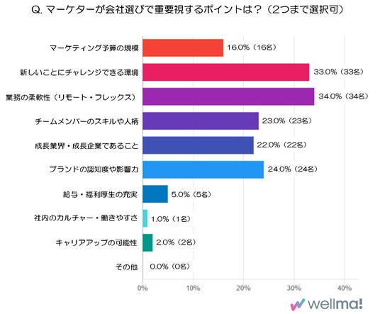 こうした現場の疑問や課題を明らかにするため、自社のサービスや価値をマーケティング担当者1万人に直接届けられる次世代型プラットフォーム「Wellma(ウェルマ)」(https://wellma.jp/column/sns_easy_steps_guide/ )は、2025年3月18日にマーケター100名を対象に、「マーケターが会社選びで重要視するポイントは?」という独自アンケート調査を実施しました。