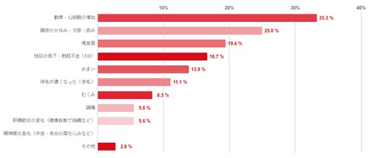 「動悸・心拍数の増加」との回答が共に33.3%で最も多く、次いで「頭皮のかゆみ・発疹・赤み」との回答が25.0%、「倦怠感」との回答が(19.4%)となった。そのほか、「性欲の低下・勃起不全(ED」、「めまい」、「体毛が濃くなった(多毛)」などの回答も少数みられた。
