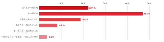 「そう感じた(知られにくいと感じた)」との回答が47.1%で最も多く、次に「とてもそう感じた(とても知られにくいと感じた)」との回答が22.4%となり、回答者の約7割がご家族や同居人に、クリニックフォアでAGA治療を受けていることが「知られにくい」と感じていることがわかった。また、「あまりそう感じなかった」との回答は8.2%で「まったくそう感じなかった」と回答した人はいなかった。