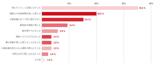 「特にデメリットは感じなかった」と回答した人が35.3%で最も多かった。なお、デメリットとしてあがった回答として「医師との対話時間が短いと感じた」が20.0%で最も多く、次いで「対面診療に比べて安心感が少ない」が15.3%、「配送料が負担に感じる」が9.4%と続いた