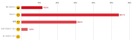 「勧めたい」と回答した人が54.1%で、過半数となり最も多く、「強く勧めたい」(11.8%)との回答と合わせると6割以上の人が薄毛で悩んでいる友人や家族などにクリニックフォアを勧めたいと思っていることがわかった。反対に、「あまり勧めたくない」と回答した人は3.5%と僅かで「全く勧めたくない」と回答した人はいなかった。