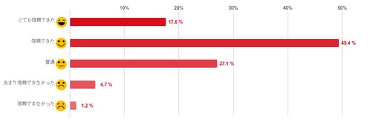 「信頼できた」と回答した人が49.4%で約半数となり最も多く、「とても信頼できた」(17.6%)との回答と合わせると7割近くの人が医師の説明や対応について「信頼できた」と感じていることがわかった。反対に、「あまり信頼できなかった」と回答した人は4.7%と少数となり、「信頼できなかった」と回答した人は僅かだった。