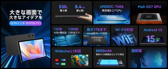 SVITOO P11 は 10.95 インチ大画面。約 530g・8.4mm の軽薄ボディに、UNISOC-T606 8 コア CPU、Mali-G57 GPU 搭載。12GB(4GB+8GB)メモリ、128GB ストレージは microSD で 1TB まで拡張。Wi-Fi5、Android 15、Widevine L1 対応で高画質動画視聴。8000mAh バッテリーで長時間再生、顔認証で利便性アップ。ワークからエンタメまで、大画面で快適体験提供 。