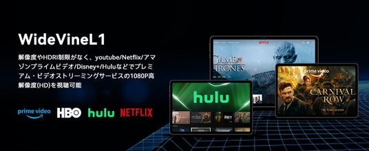 WideVine L1 対応で、解像度や HDR 制限なく、YouTube、Netflix、アマゾンプライムビデオ、Disney+、Hulu などのプレミアム動画ストリーミングサービスで 1080P 高解像度(HD)視聴可能。prime video、HBO、hulu、NETFLIX など人気プラットフォームのクオリティある映像を、端末で存分にお楽しみいただけます 。