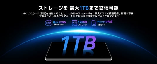 MicroSD カード(別売り)を使えば、ベースの 128GB ストレージを最大 1TB まで拡張。動画・写真・音楽など、好きなファイルをガンガン保存できる。加えて RAM は最大 12GB(4G + 8G)に対応。大容量ストレージ × 十分なメモリで、多くのデータを溜めてもスムーズ動作 。