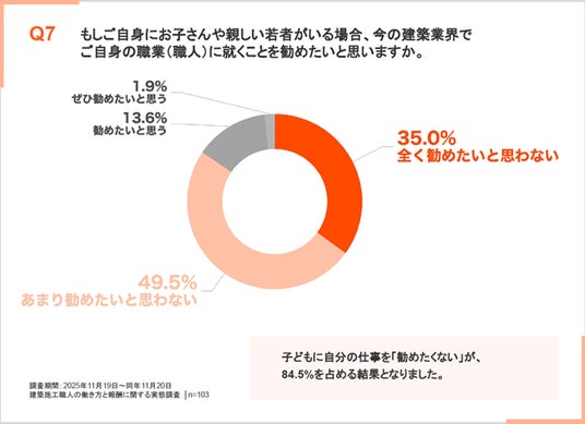 一方、建築士や職人は過剰な中間コストの圧力のもと、適正な報酬も受け取れず、技術を継承する余裕さえ失いつつあります。これは、業界全体の衰退に直結する危機です。特に職人では自分達の職業(職人)に就くことを勧めたいと思っていない方が80%を越えてしまっています。