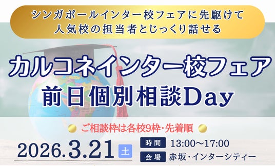 シンガポールで10年以上にわたり日本人家族のインター校入学支援を行う教育コンサルティング会社 Culture Connection Pte Ltd(カルコネ、本社:シンガポール、代表:岡部優子)が、2026年3月22日(日)、東京・恵比寿にて『第3回 カルコネ シンガポールインター校フェア2026』を開催いたします。