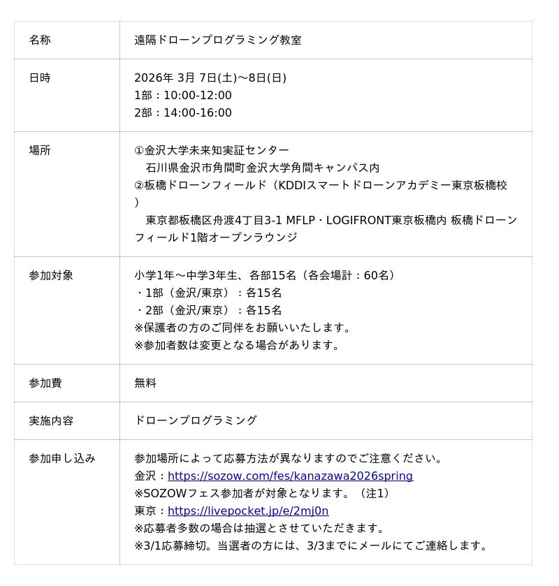 本イベントは、「SOZOWフェス Kanazawa 2026 Spring with 金沢大学」が開催される金沢大学未来知実証センターと板橋ドローンフィールド(KDDIスマートドローンアカデミー東京板橋校)の2拠点で実施し、それぞれ対象は小学1年生から中学3年生までの参加者を各回15名募集します。(注1)