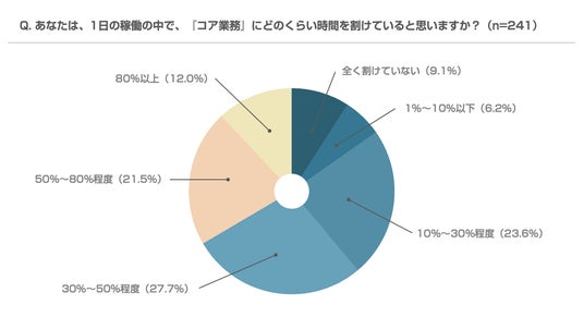 「1日の稼働の中でコア業務にどのくらい時間を割けているか」という質問に対し、3人に2人(66.6%)のエンジニアが50%以下と回答、約1割(9.1%)のエンジニアは全く時間が割けていない実態が明らかになりました。一方、80%以上コア業務に避けていると回答したのは約1割(12.0%)止まりという結果でした。