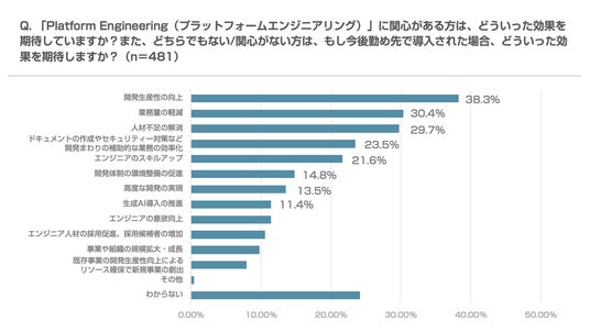 プラットフォームエンジニアリングに期待する効果は、「開発生産性の向上(38.3%)」「業務量の軽減(30.4%)」「人材不足の解消(29.7%)」「ドキュメントの作成やセキュリティー対策など開発まわりの補助的な業務の効率化(23.5%)」が上位でした。プラットフォームエンジニアリングを活用して業務量の軽減や効率化をすることにより、人材不足を解消したり開発生産性を向上することに期待するニーズが多いことがわかりました。
