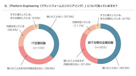 海外では2022年から浸透が加速している「プラットフォームエンジニアリング」については、すでに半数以上が「導入している・検討している」「内容を知っている」「聞いたことはある」と回答するなど、日本でも認知度や理解度が浸透している様子がみて取れる結果となりました。