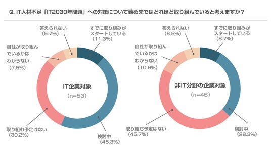 IT人材「2030年問題」の対策について、IT企業の経営者・役員の約半数(45.3%)が「検討中」、約1割(11.3%)が「すでに取り組みがスタートしている」と回答しました。対し、非IT分野の企業の経営者・役員は約半数(45.7%)が「取り組む予定はない」と回答し、IT企業と非IT分野の企業では、取り組み状況に差がありました。