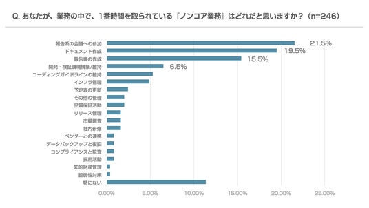 2)最も時間を取られているノンコア業務は「報告系の会議への参加(21.5%)」「ドキュメントの作成(19.5%)」などが上位