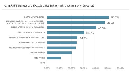 5)IT人材不足対策の取り組み内容は「シニアエンジニアの採用強化(50.7%)」「業務の効率化や自動化などのツール導入(47.4%)」が上位