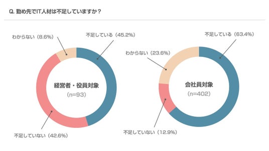 「IT人材は不足していますか?」という質問に対し、6割(60.0%)が「不足している」と回答しました(図3-a)。また、職種別にみると、「不足していない」と回答したのが経営者・役員では約5割(46.2%)に対し、会社員は約1割(12.9%)(図3-b)と、経営層と現場との認識のギャップが見られました。