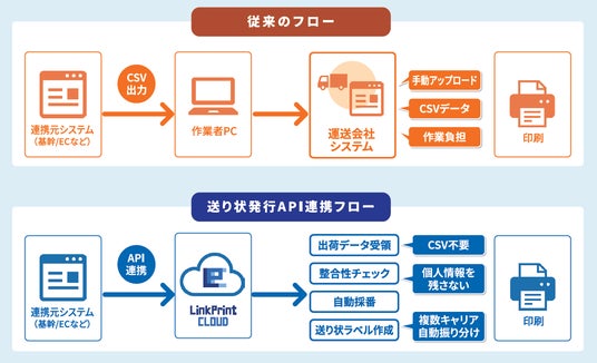これまで多くの出荷業務では、基幹システムやECシステムから出荷データをCSVで書き出し、運送会社システムにログインしてアップロード、その後に伝票番号を取り込み、ラベル印刷を行う必要がありました。