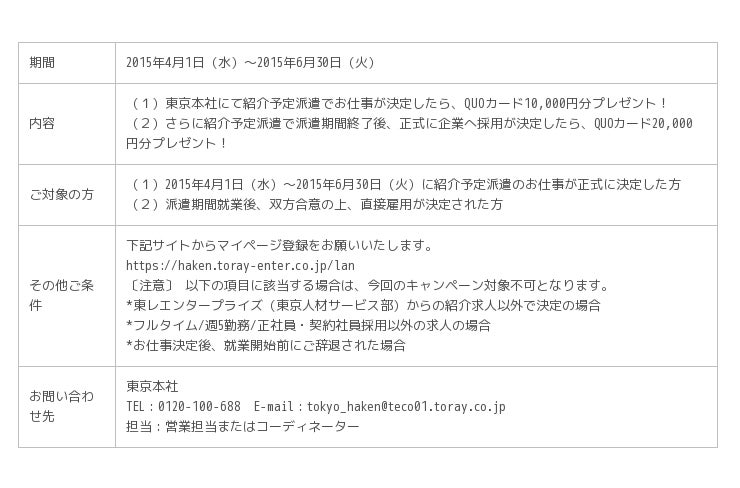 4月1日より、関東エリアにて、ご登録・新規ご就業していただいた方を対象としたキャンペーンを実施いたします。まずは、ご登録お待ちしております!
