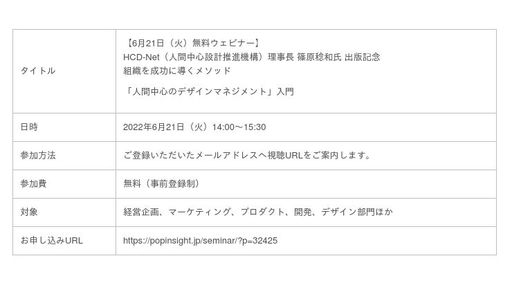 株式会社メンバーズ(本社:東京都中央区、代表取締役社長:剣持 忠)の社内カンパニーであるポップインサイトカンパニー(本社:東京都中央区、カンパニー社長:久川 竜馬)は、「デザインを組織や経営に活かすために学ぶべき視点、実践していくべきこと」ついてご紹介するウェビナーを6月21日(火)に開催いたします。