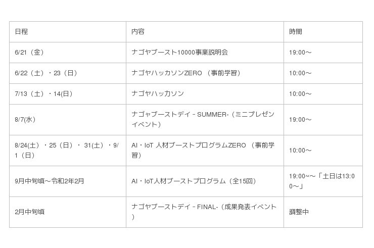 さらに、今年は、NAGOYA HACKATHON ZERO、AI・IoT人材BOOSTプログラム ZERO、NAGOYA BOOST DAY SUMMERの取組みを追加し、さらにパワーアップした形で実施します。第一弾として、「NAGOYA HACKATHON(ナゴヤハッカソン)」と「NAGOYA HACKATHON ZERO」の参加者を募集します。