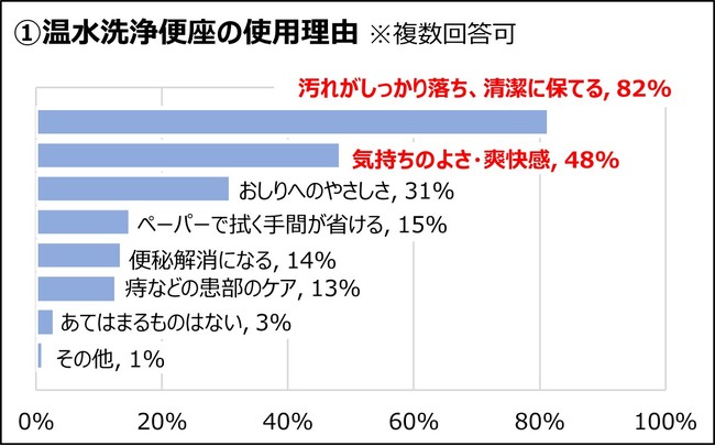 温水洗浄便座の利用理由は、「汚れがしっかり落ち、清潔に保てる」が82%と最も多く、