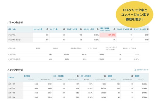 テスト終了後は、勝敗結果だけでなく、ステップごとの詳細分析もあわせて確認できるので、CVR改善への最短ルートを見つけられます!