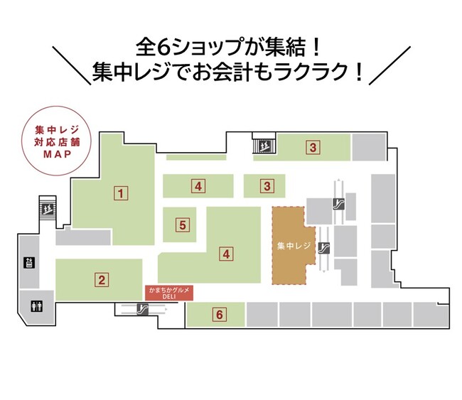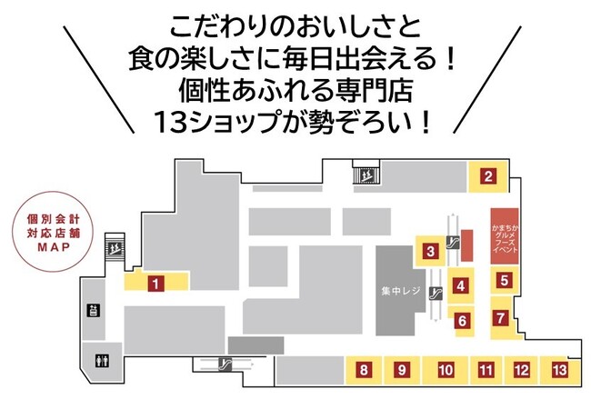 グロッサリーと生鮮食品の店舗のお会計を集中レジでまとめて行うことが可能に。店舗ごとに支払う手間がなくなり、毎日のお買い物がより便利になります。 【2.発見】各店の味を小分けパックで満喫できるコーナー 「かまちかグルメDELI(デリ)」を新設!